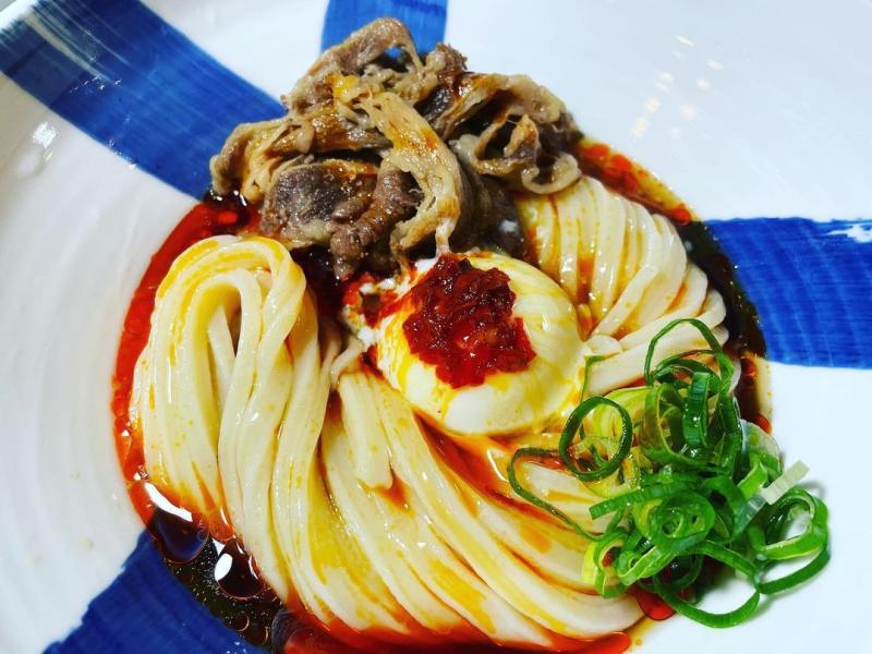 「Cold udon + beef + soft boiled egg + hot sauce」