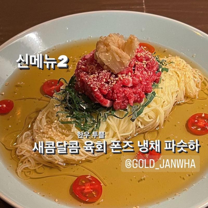 한우 육회를 얹어 메인 메뉴로 내봤습니다