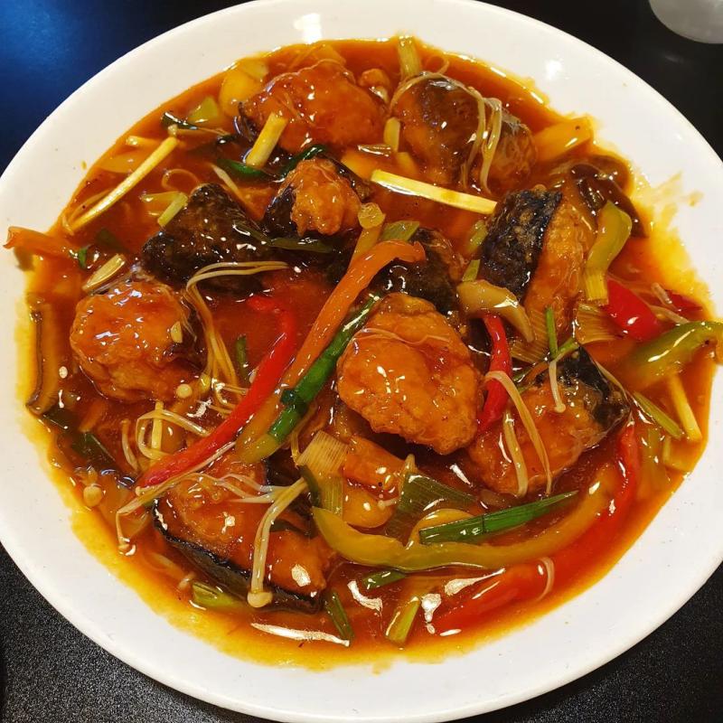 : 뼈있는 닭고기를 튀겨 고추, 설탕, 간장으로 향을 낸 요리
