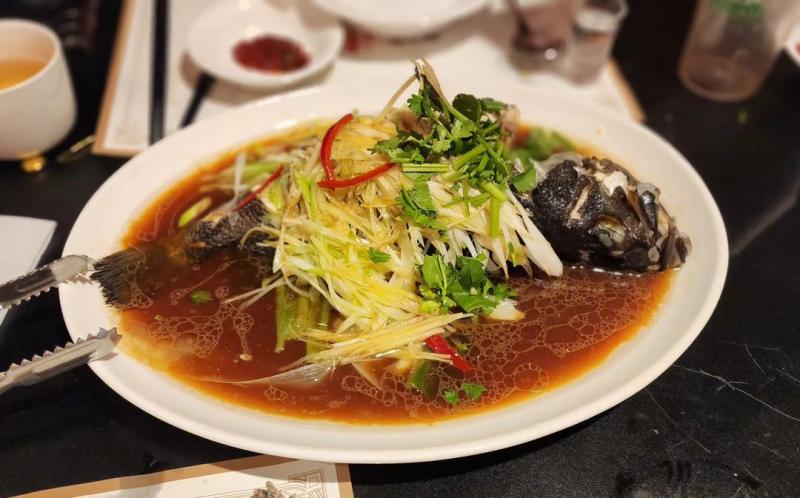 우럭을 통으로 찐 후, 튀긴 대파 / 생강 / 간장소스를