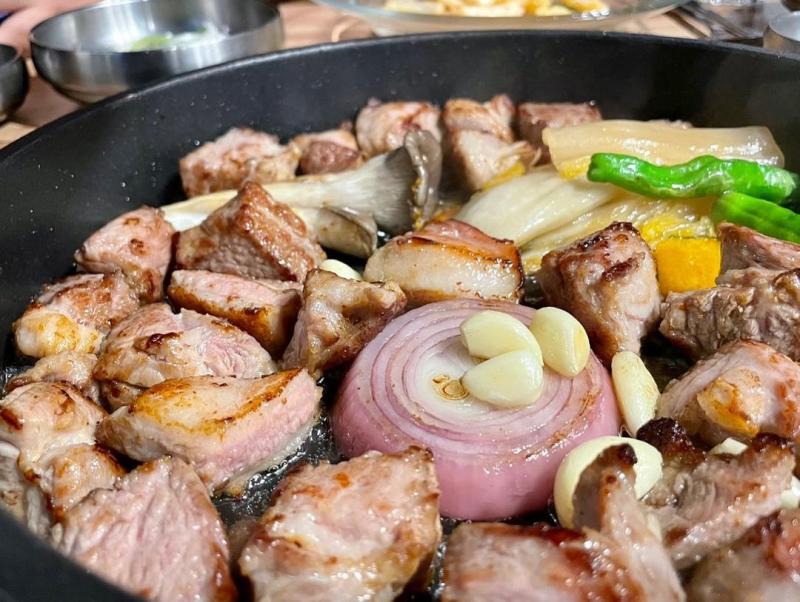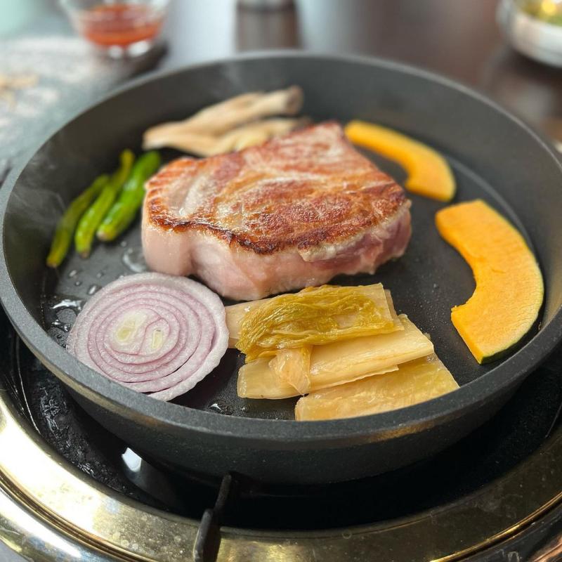 특허받은 소금누룩숙성 목살이 두꺼운 무쇠팬에 구워지면서 빵을 굽는듯한 고소한 냄새를 풍긴다, 이 고소한 향이 사람을 미치게 한다.