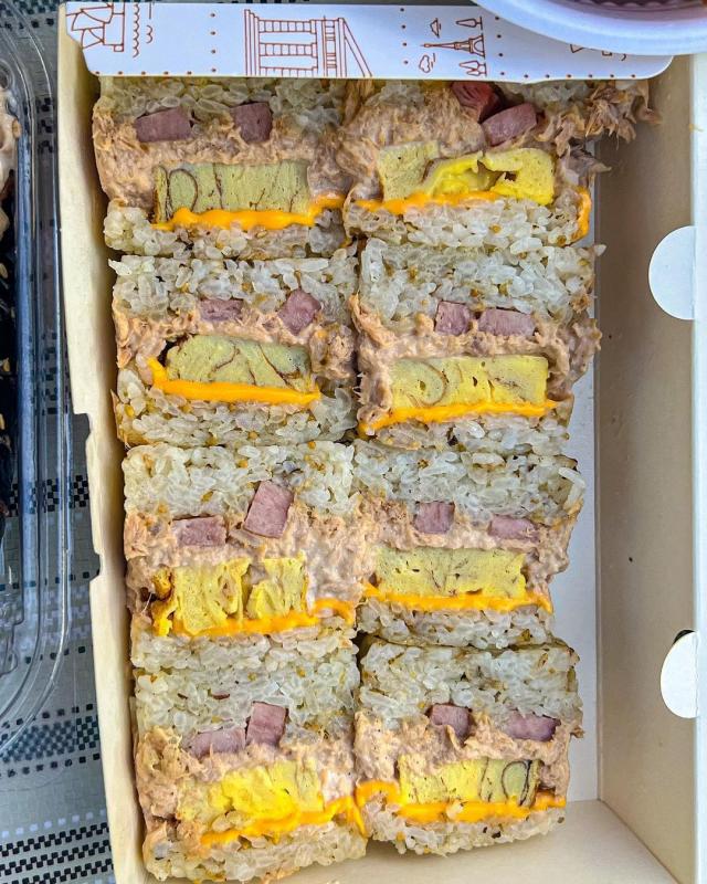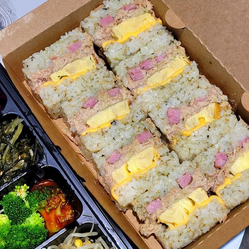 밥샌드 사이에 참치마요,계란,햄,와사비가 들어있어요